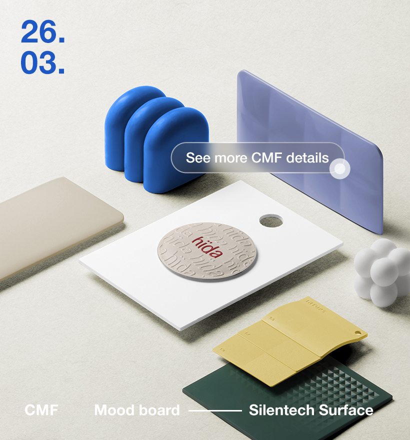 CMF that conceals technology and awakens the senses. Click the image for a closer look at the authentic surface textures of Hanji leather, biodegradable plastics, and recycled materials.